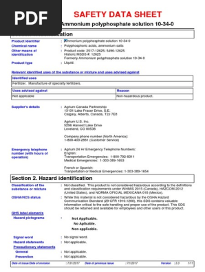 Symptoms injuries after ingestion. Ammonium polyphosphate turf horticulture inorganic salt solution 1 of 4. Chemical product and company identification. Material safety data sheet 10 34 00 agrisolutions ammonium polyphosphate solution page 1 of 4 for chemical emergency spill leak fire exposure or accident call chemtrec day or night 1 800 424 9300 or 1 800 228 5635 1.