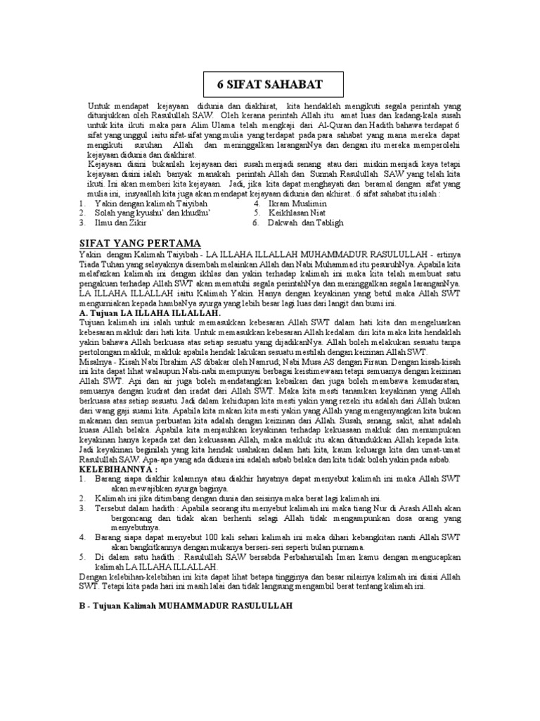 6 sifat para sahabat ringkas. Meliputi iman ibadah muamalah mu asyarat dan akhlaq. Pada saat ini umat islam tidak ada kekuatan dan kemampuan untuk mengamalkan agama secara sempurna. Solat khusu dan khudu 3. Yakin atas kalimah thoyyibah laa ilaaha illallah muhammadurrasulullah 2.