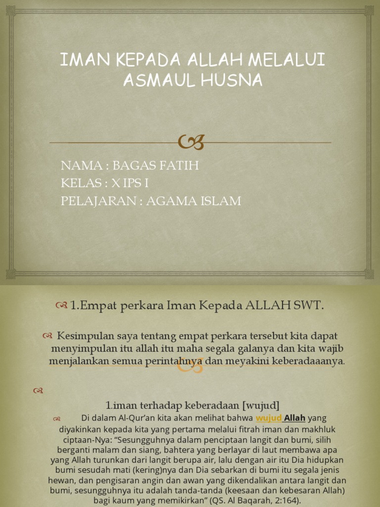 Apa maksud beriman kepada allah melalui asmaul husna. Al karim maha pemurah sehingga sebagai wujud keimanan tersebut kita harus menjadi orang yang pandai membagi kebahagiaan kepada orang lain baik dalam bentuk harta atau bukan. Selain sifat jaiz mustahil dan sifat wajib allah memiliki nama nama yang baik dan agung yang disebut asmaul husna. Iman kepada allah swt melalui asmaul husna adalah kita meyakini akan adanya allah swt sebagai tuhan yang maha esa dengan segala kesempurnaan nya rasa percaya yakin ini dapat di tumbuhkan melalui berbagai cara salah satunya melalui asmaul husna. Ayo ikuti pelajaran ini insya allah kalian dapat membuktikan adanya allah swt dan para rasul rasulnya.