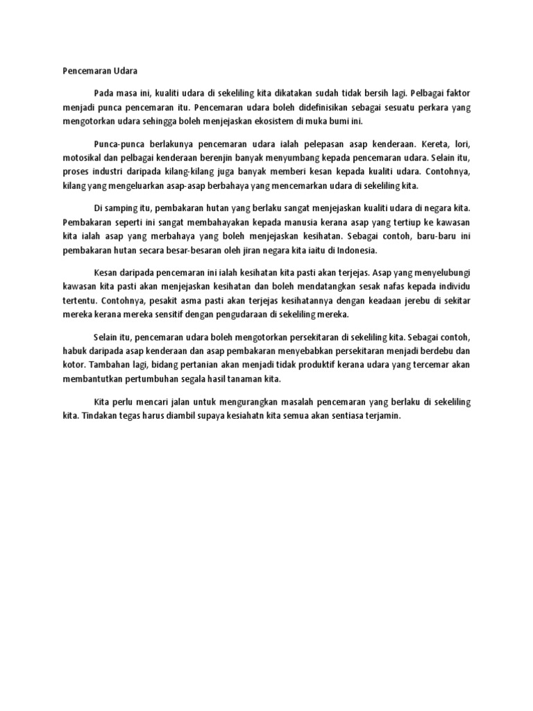 Selain itu bukan sahaja gas gas pencemar dilepaskan oleh industri manakala habuk habuk yang mampu mengakibatkan sesak nafas manusia juga dilepaskan. Antara kesan pencemaran udara adalah penipisan lapisan ozon jerebu hujan asid dan pemanasan bumi. Masyarakat moden di semenyih amat bergantung kepada pengangkutan bermotor seperti kereta lori dan motor. Dengan adanya penyuluhan tentang bahaya asap kendaraan bermotor diharapkan masyarakat dapat mengetahui cara mencegah pencemaran udara oleh asap kendaraan bermotor.