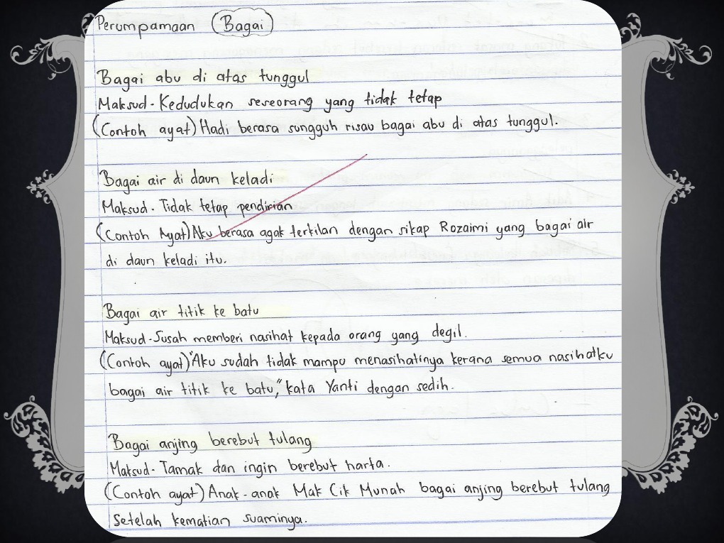 Bagai anjing buruk kepada orang yang telah diketahui kejahatannya akan dibenci oleh masyarakat. Bagai enau dalam belukar. Bagai air titik ke batu peribahasa yng arti lengkapnya kurang lebih sebagai berikut. Bagai air titik ke batu.
