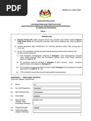Borang laporan penilaian prestasi khas doc. Surat pekeliling perkhidmatan bil. Kepada pegawai pegawai kakitangan awam yang dalam pemangkuan perlu mengisi borang laporan penilaian prestasi khas untuk urusan perakuan kenaikan pangkat sama ada hakiki atau khas untuk penyandang kup sila klik di sini untuk muat turun borang tersebut. Sulit borang j p a prestasi 2 2002. Pegawai penilai pp iaitu pegawai penilai pertama ppp dan pegawai penilai kedua ppk.