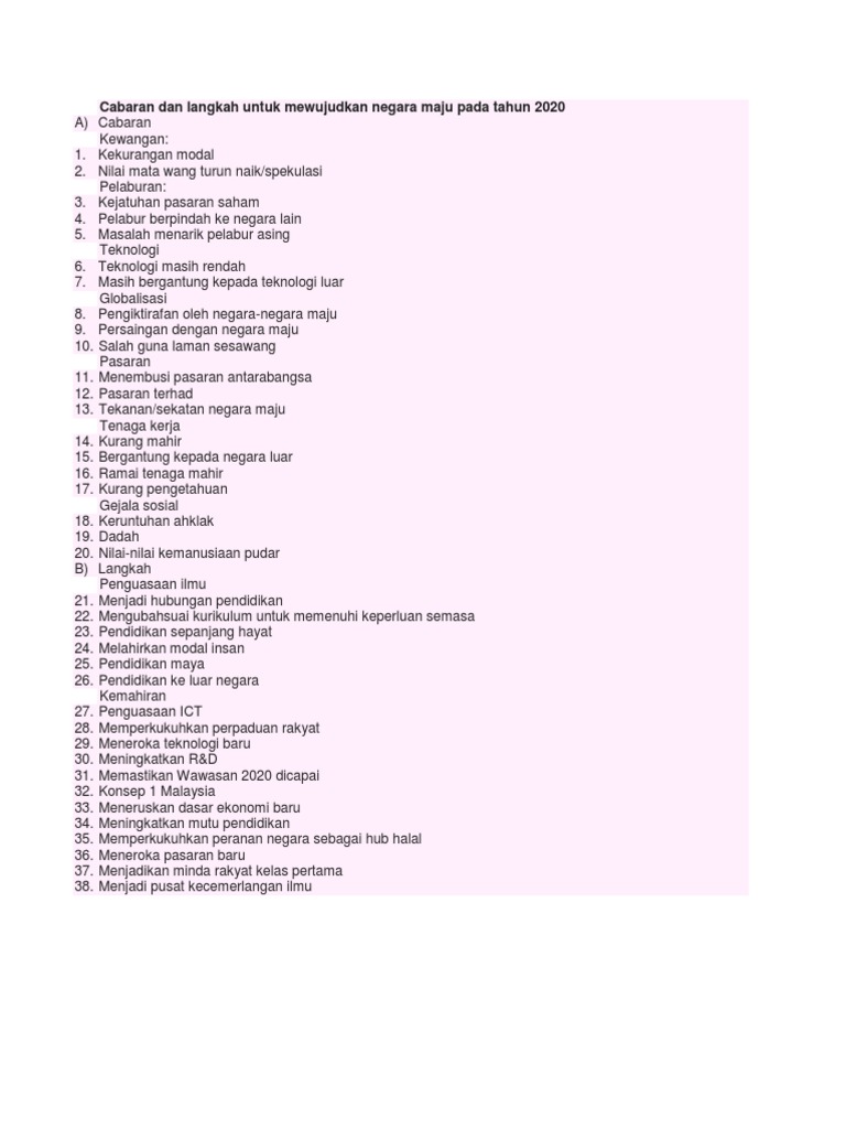 Cabaran dan langkah malaysia menjadi negara maju. Menjelang tahun 2020 malaysia dapat menjadi negara bersatu dengan masyarakat malaysia yang yakin mempunyai nilai moral dan etika yang kukuh hidup dalam masyarakat yang demokratik liberal dan bertolak ansur penyayang adil dari segi pengagihan ekonomi progresif dan makmur dan mempunyai penguasaan sepenuhnya terhadap ekonomi yang. Antara langkah langkah membentuk malaysia sebagai sebuah negara maju ialah kita perlulah sentiasa bersikap inovatif dan berusaha memperbaiki kelemahan diri supaya dapat membantu meningkatkan taraf kehidupan keamanan dan perpaduan perlulah sentiasa dipelihara kerana kemajuan sesebuah negara itu dipengaruhi oleh keadaan didalam. Nilai mata wang turun naik spekulasi pelaburan. Masalah menarik pelabur asing teknologi 6.