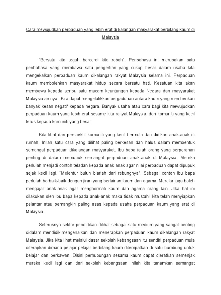 Justeru peranan rakyat sendiri tidak boleh dinafikan kepentingannya dalam usaha memupuk perpaduan kaum di negara kita. Quantity is quality 1 5. Tidak bergaduh antara kaum. Negara yang mempunyai berbilang kaum sangat memerlukan usaha usaha untuk memupuk perpaduan kaum bagi membina negara yang harmoni.