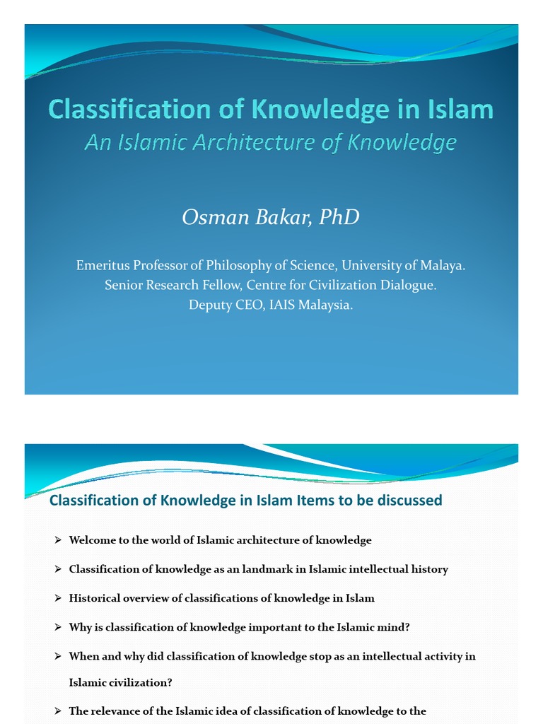 Introductory essay by mehdi golshani. Dr bakar is an author of 18 books and more than 300 articles on various aspects of islamic thought and civilization particularly islamic science and philosophy. Classification of knowledge in islam 9 9 the worldly and other worldly rational sciences 217 9 10 significance of the division into presential and attained knowledge 218 9 11 conclusion 219 part iii. The lives and the ideas of the three thinkers discussed in classification of knowledge in islam al farabi 870 950ad.