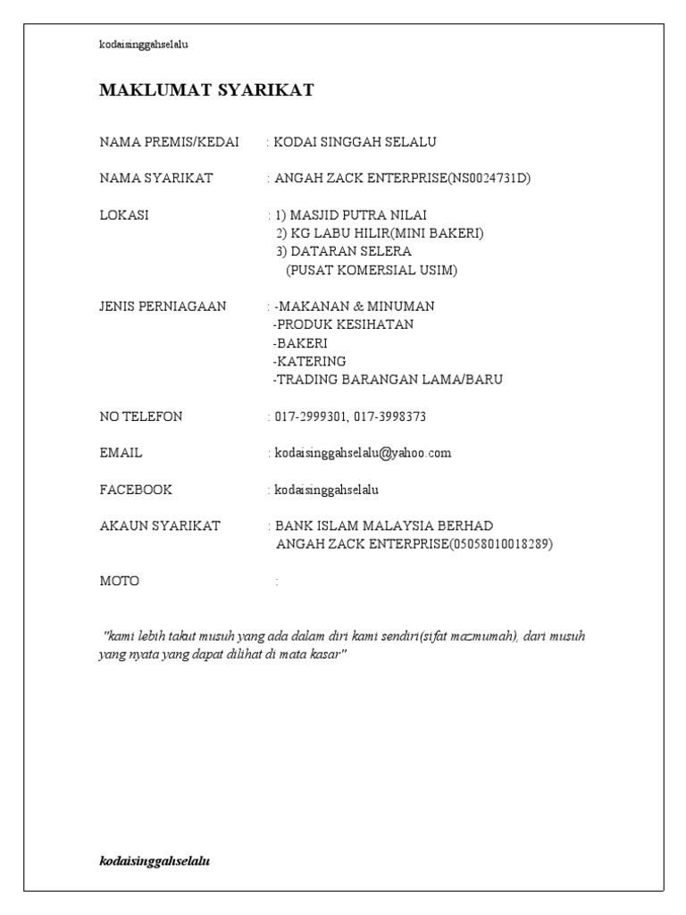 Profil syarikat ep supply services ma0094482 t. Contoh proposal usaha makanan ringan dewasa ini dunia wirausaha sepertinya memang banyak digeluti oleh semua orang khususnya anak anak muda yang penuh dengan inspirasi. Mulai dari oalahan tradisional kue kue basah hingga camilan sejenis kerupuk. Contoh profile syarikat 1.