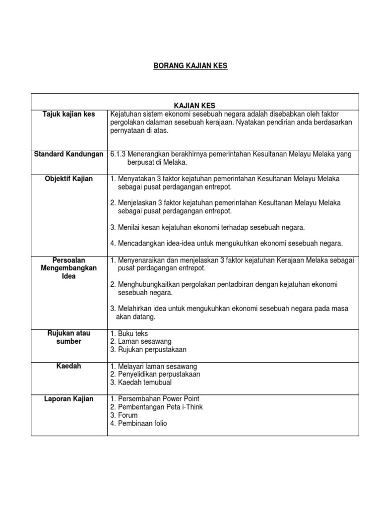 Ini juga termasuk yang ditulis oleh tome pires iaitu suma oriental pada 1512 1515 yang hanya berdasarkan pengumpulan maklumat menggunakan kaedah dengar dan cakap. Senarai kandungan 1 1 penghargaan 1 pendahuluan 2 objektif kajian 2 kawasan kajian 3 kaedah kajian 6 hasil kajian 7 rumusan 8 rujukan lampiran. Melalui pemahaman ini dapat melahirkan kesedaran tentang wujudnya satu ketamadunan melayu yang tinggi pada zaman dahulu. Contoh kerja kursus sejarah tingkatan 1.
