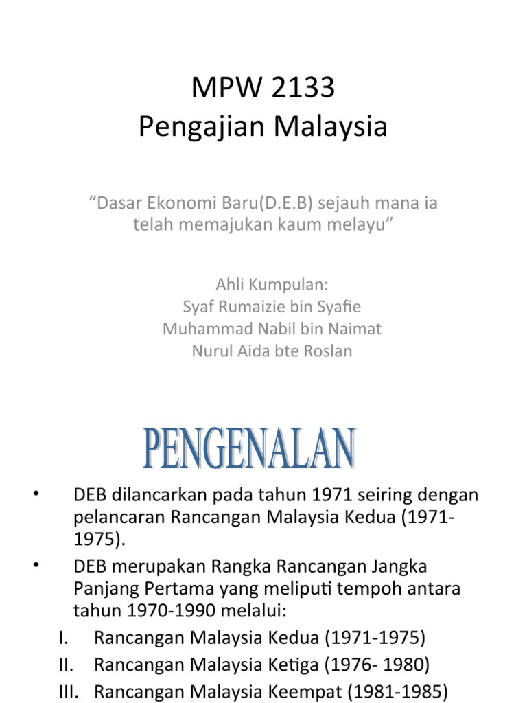 Dasar ekonomi baru pengajian malaysia. Kerajaan telah membentuk dasar ekonomi baru deb yang menjadi satu rangka rancangan panjang mencakupi tempoh selama 20 tahun 1970 1990. Hal ini dilakukan dilakukan kerana terjadinya peristiwa 13 mei 1969. Dpn dilaksanakan dalam tempoh rangka rancangan jangka panjang kedua rrjp2 1991 2000 bagi tempoh sepuluh tahun sahaja. Unsubscribe from nurin s.