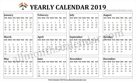 India 2019 calendar online and printable for year 2019 with holidays.