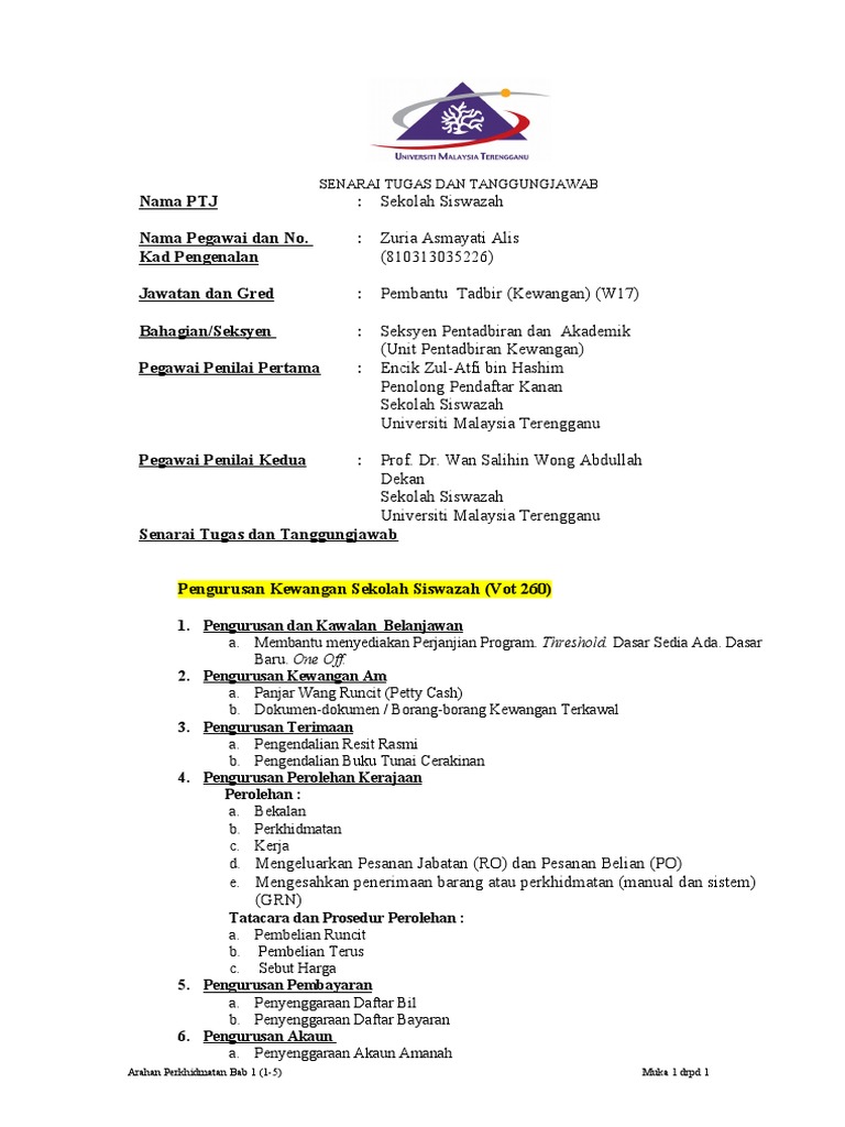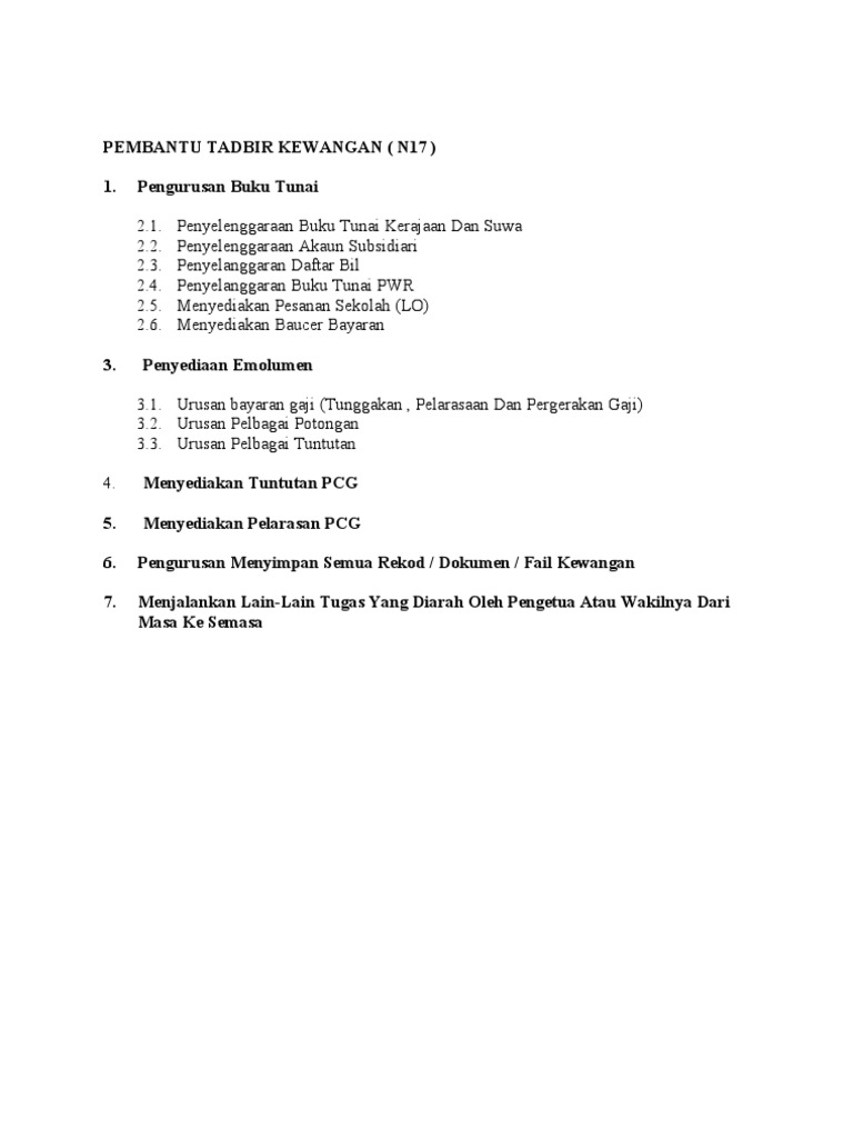 Senarai tugas pembantu tadbir kewangan gred w19 spa panduan buat mereka yang berminat dengan jawatan pembantu tadbir kewangan tahukah anda apa skop kerja atau deskripsi tugas pembantu tadbir kewangan gred w19. Pelaksanaan deskripsi tugas sektor awam melalui perenggan 7 dan 8 pekeliling ini deskripsi tugas job description jd diperkenalkan bagi menggantikan senarai tugas. Perkongsian kali ini melibatkan pelbagai koleksi deskripsi tugas bagi jawatan akp di sekolah deskripsi tugas job description jd merupakan dokumen yang menjelaskan tujuan pewujudan sesuatu jawatan dengan mengambil kira komponen akauntabiliti dimensi dan kompetensi yang diperlukan bagi sesuatu jawatan dalam organisasi. Menjalankan tugas tugas perkeranian selaras dengan fungsi tugas jabatan bahagian yang berkenaan seperti tugas tugas penyelenggaraan fail dokumen pengiraan penyediaan laporan bulanan statistik serta penyediaan.