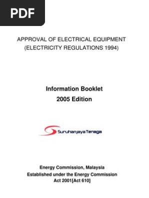 Electricity regulations 1994 malaysia pdf. L77 26 3 1973 p 29 on the harmonisation of the laws of member states relating to electrical equipment designed for use within certain voltage limits as amended by council. The supply of electricity at reasonable prices the licensing of any electrical installation the control of any electrical installation plant and equipment with respect to matters relating to the safety of persons and the efficient use of electricity and for purposes connected therewith. Exhibitors exhibitors who display electrical equipment under sub regulation 97 1 of the electricity regulations 1994 are also required to apply for coa. 11 2 of the electricity regulations 1994 to estimate the maximum current demand and the diversity factors that may be used for domestic installations.