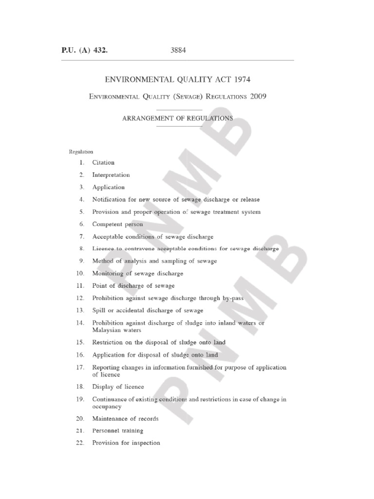 Key highlights of environmental quality sewage regulations 2009 regulation no. Environmental quality sewage regulations 2009 pu a 432 2009 checkpoint cp 2. Environmental quality sewage regulations 2009.