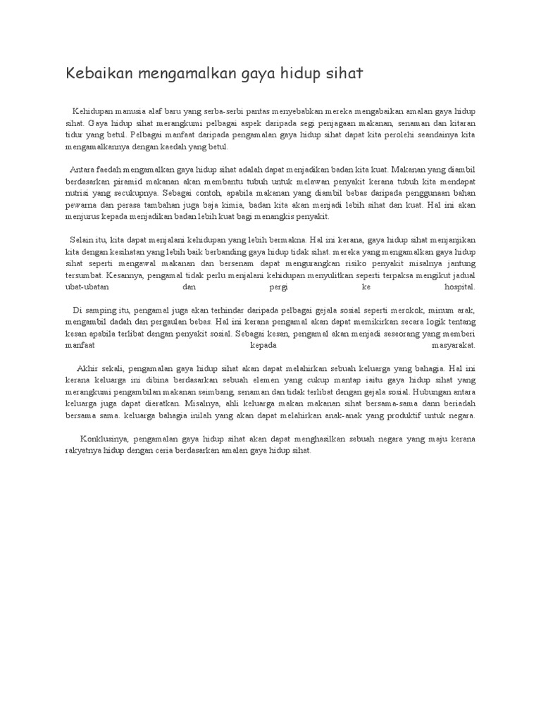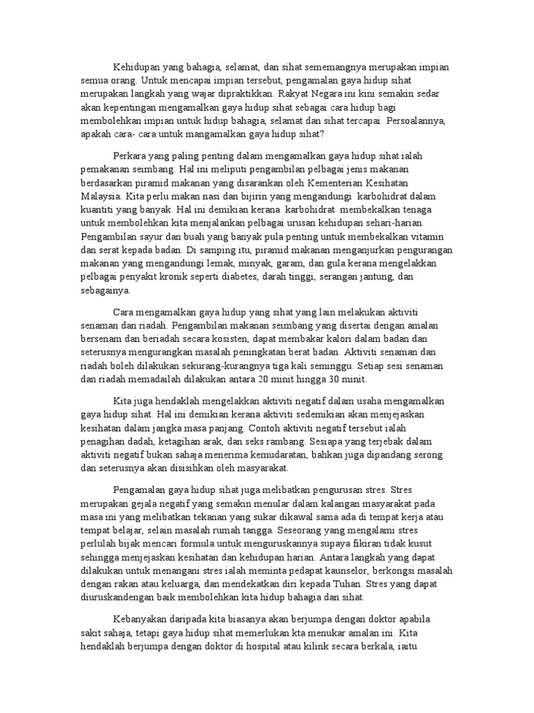 Faedah mengamalkan gaya hidup sihat spm. Amalan gaya hidup sihat adalah cara hidup yang boleh mengurangkan pelbagai risiko penyakit pada masa hadapan. Dengan mengamalkan gaya hidup sihat seseorang akan sentiasa sihat cergas dan bertenaga. Sekaligus mengurangkan hidup terbeban akibat komplikasi penyakit tersebut yang boleh menyebabkan masalah sosial ekonomi dan emosi. Walaupun begitu matlamat tersebut tidak mudah dicapai sekiranya seseorang itu tidak mengamalkan gaya hidup sihat.
