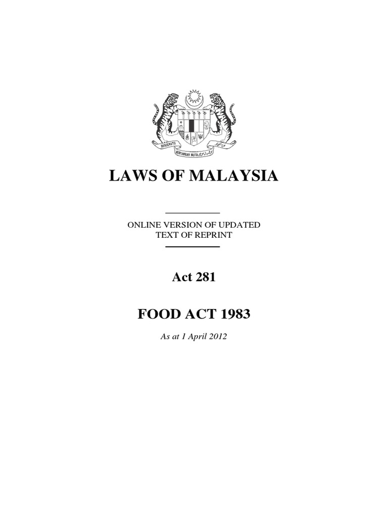 1 october 1985 p u. B 446 1985 be it enacted by the seri paduka baginda yang di pertuan. 6 laws of malaysia act 281 food 7 laws of malaysia act 281 food act 1983 an act to protect the public against health hazards and fraud in the preparation sale and use of food and for matters incidental thereto or connected therewith. The food safety and quality division fsqd of the ministry of health moh is charged with the implementation and enforcement of the law.