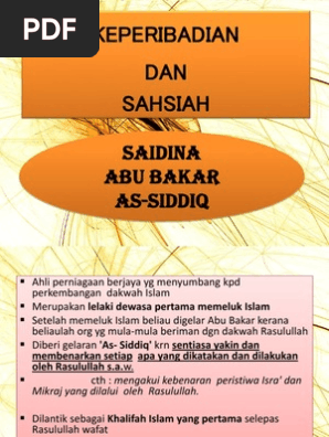 Abu bakar kemudian berkata engkau benar aku bersaksi bahwa engkau utusan allah maka rasulullah pun berkata kepada abu bakar engkau adalah abu bakar ash shiddiq sejak saat itulah rasulullah shallallahu alaihi wasallam memberi gelar as siddiq kepada abu bakar. Dari pernikahan tersebut lahirlah abdullah dan asma. His full name is abdullah bin abu quhafah uthman bin aamer al qurashi al taymi. Beliau termasuk di antara mereka yang paling awal memeluk islam.