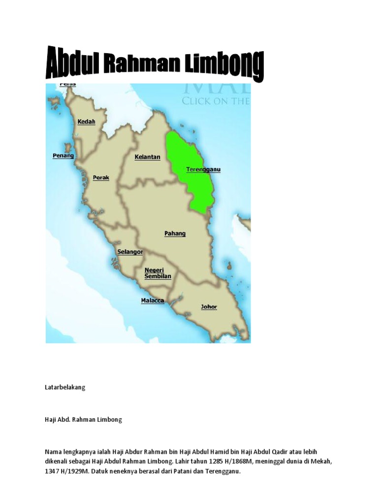Haji abdul rahman bin haji abdul hamid 1868 1929 was an ulema known as haji abdul rahman limbong because he visited limbong kemaman to teach islam and start trading. Haji abdul rahman limbong sebagai anak jati terengganu telah banyak memberi sumbangan kepada para penduduk tempatan sama ada dalam bidang agama undang undang atau ekonomi. From 1922 until 1928 he was a resistance leader seeking to resist laws and changes introduced by the british. Syed sagof merpakan murid kesayaangan haji abdul rahman limbong.