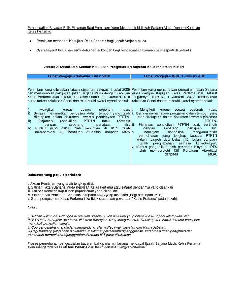 Salinan sijil perakuan akreditasi daripada mqa yang disahkan bagi peminjam ipts. Salinan ijazah sarjana muda kepujian kelas pertama atau setaraf dengannya yang disahkan skrol. Kelas pertama cgpa 3 50 4 00 kelas kedua atas cgpa 3 00 3 49. Diploma tiada ye keistimewaan dalam pengecualian pembayaran ptptn.