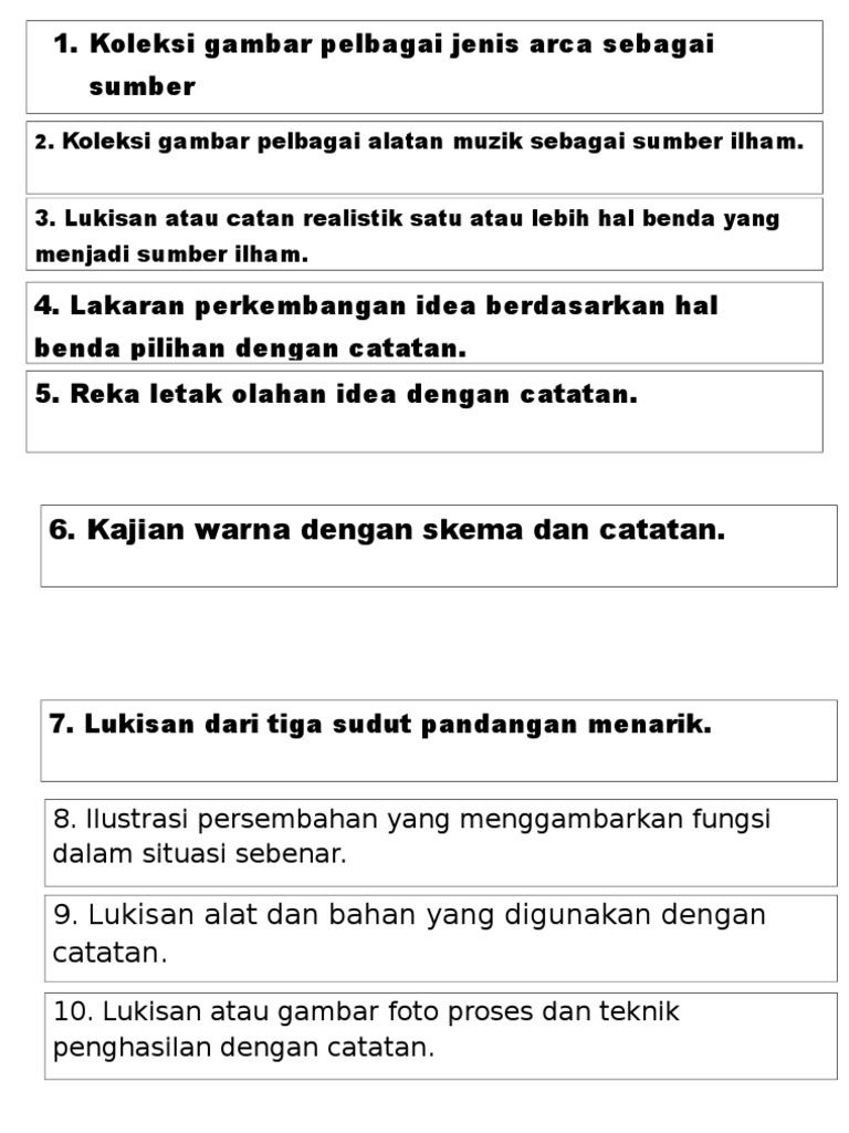 Ilustrasi persembahan yang menggambarkan fungsi dalam situasi sebenar. Lukisan atau gambar foto proses dan teknik penghasilan dengan catatan. Lukisan alat dan bahan yang digunakan dengan catatan. Ilustrasi persembahan yang menggambarkan fungsi dalam situasi sebenar. Hasil kerja calon mesti dilakukan secara manual dan calon tidak dibenarkan menghasilkan kerja dalam bentuk kolaj sepenuhnya.