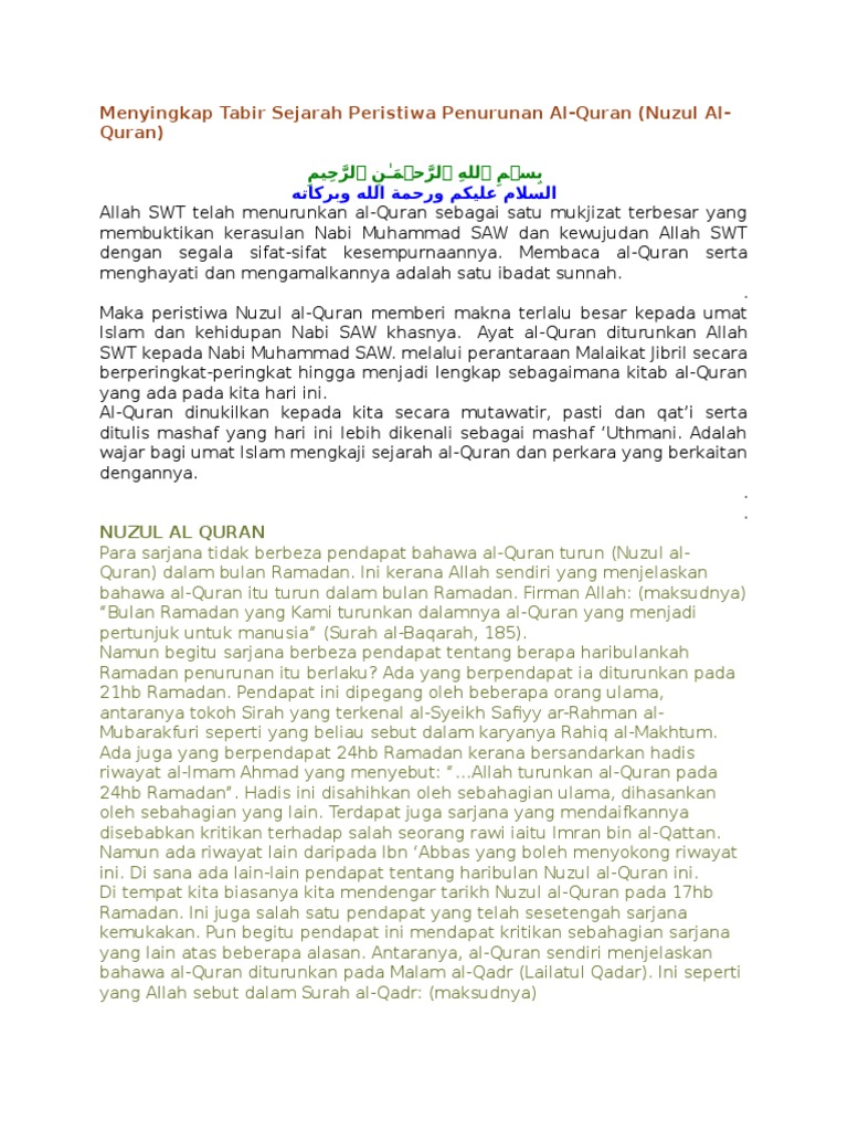 Kita akan membincangkan pelbagai peringkat penyusunan al quran sepanjang sejarah islam yang membolehkan kita melihat dan membaca quran dalam bentuknya sekarang. Bandar seri begawan 12 mei al quran diturunkan dalam dua peringkat iaitu pertama diturunkan pada malam lailatulqadar dan kedua diturunkan secara beransur ansur. Kenyataan al quran ini merujuk kepada masa ia diturunkan dan tidak mengenai bagaimana atau cara ia diturunkan. Iaitu peringkat penurunan dari baitul izzah ke dada rasulullah saw secaraberansur ansur.