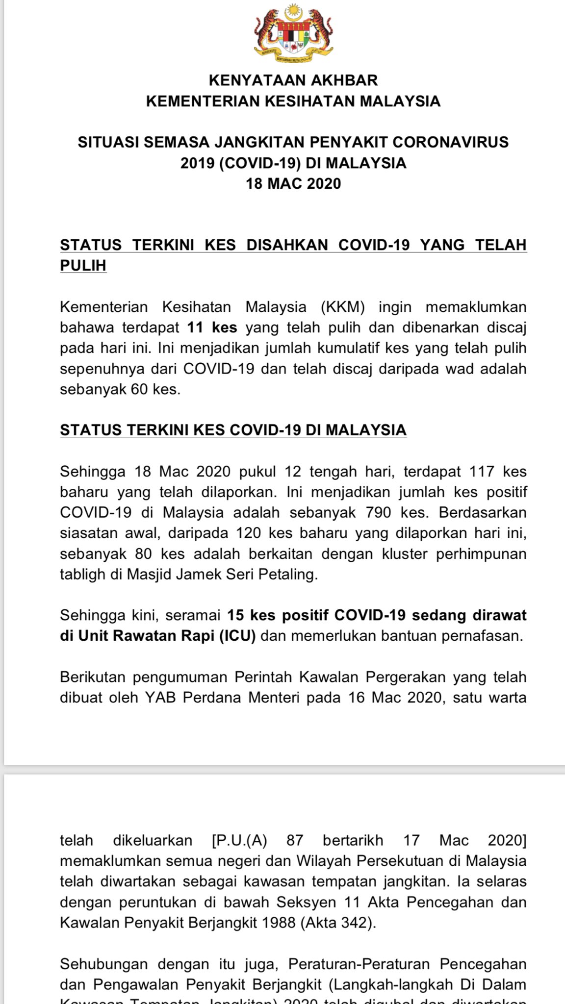 Setakat 19 april 2018 terdapat 6 292 buah masjid di malaysia. Itulah proyeksi jumlah penduduk malaysia tahun 2020. Solat jumaat dan fardu di masjid serta surau dengan jumlah jemaah terhad dibenarkan di selangor. Bagi masjid di seluruh negeri yang berada dalam mukim zon hijau bilangan jemaah dihadkan 40 orang tidak termasuk pegawai dan ajk demikian titah baginda menerusi kenyataan hari ini.