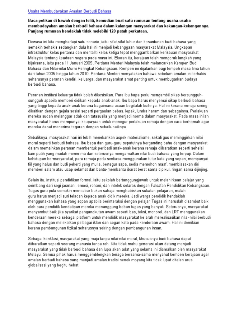 Karangan amalan berbudi bahasa spm. Bukan itu sahaja amalan murni ini akan mendidik masyarakat yang berlainan bangsa dan agama supaya sentiasa menjaga perasaan antara. Karangan berpandu diubahsuai daripada karangan hasilan nurul ashikin bt. Dengan mengamalkan gaya hidup sihat seseorang akan sentiasa sihat cergas dan bertenaga. Cerdik pandai sering menganggap amalan membaca sebagai jambatan ilmu.