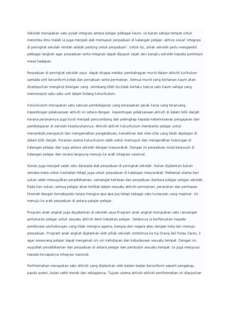 Karangan langkah langkah memupuk perpaduan kaum di malaysia. Semua pihak haruslah menggembleng tenaga dan berganding usaha untuk memainkan peranan masing masing dalam menerbitkan semangat perpaduan dalam sanubari sendiri dan orang lain. Penggunaan satu bahasa perhubungan dan persefahaman di antara satu kaum dengan yang lain dapat diwujudkan tanpa menimbulkan rasa curiga. Hal ini demikian dapat memupuk semangat kerjasama dan saling membantu antara satu sama lain dengan menghapuskan sikap mementingkan diri yang tertanam di dalam jiwa masyarakat kini. Sebagai satu daripada langkah untuk mewujudkan permuafakatan bangsa kementerian pelajaran malaysia telah mewajibkan pelajar pelajar agar lulus dalam mata pelajaran sejarah di peringkat sijil pelajaran malaysia spm.