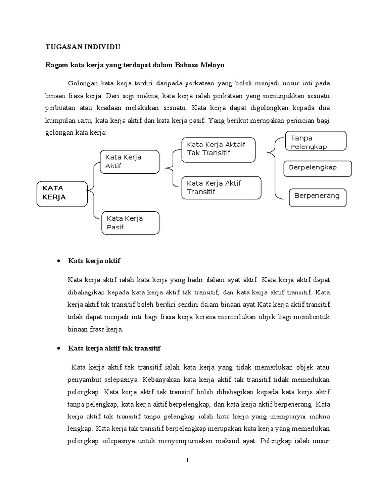 Salah dia bertemu rakannya di bandar dia bercerita pengalamannya di luar negara. Berpenerangkata kerja aktif tak transitif tanpa pelengkap ialah kata kerja yang boleh berdiri sendiri dalam predikat ayat. Kata kerja aktif tak transitifkata kerja aktif tak transitif terbahagi kepada 3 iaitu. Terdapat kata kerja tak transitif yang berpelengkap iaitu kata kerja yang mesti diikuti oleh pelengkap untuk menyempurnakan maksud ayat.