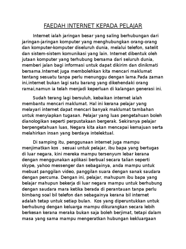 Justeru terbukti internet banyak memberikan kebaikan kepada peajar terutamapelajar yang bijak menggunakan aplikasi ini untuk tujuan meningkatkan kemahiran dalam pembelajaran. Oleh itu kita hendaklah menggunakan internet dengan baik. Kesimpulannya penggunaan internet mendatangkan pelbagai manfaat berguna kepada masyarakat. Kebaikan dan keburukan internet kepada masyarakat.