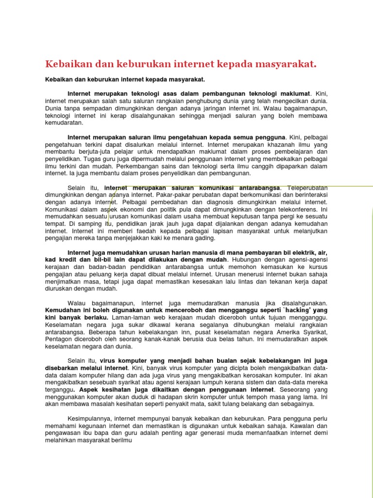 Terdapat banyak kebaikan jika kita menggunakan internet dengan baik. Kini internet merupakan salah satu saluran rangkaian penghubung dunia yang telah mengecilkan dunia. Kesimpulannya penggunaan internet mendatangkan pelbagai manfaat berguna kepada masyarakat. Internet boleh mendatangkan pelbagai kesan kepada masyarakat dan negara.