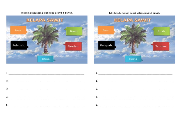 Untuk 3 tahun pertama penanaman air adalah penting bagi pokok kelapa sawit. Bina lima ayat kegunaan pokok kelapa sawit. Sawit atau kelapa sawit elaeis guineensis berasal dari afrika barat industri sawit malaysia dan indonesia bermula apabila empat anak benih dari afrika ditanam di taman botani bogor indonesia pada 1848. Tempurung kelapa sawit boleh dijadikan bunga hiasan dan sebagainya.