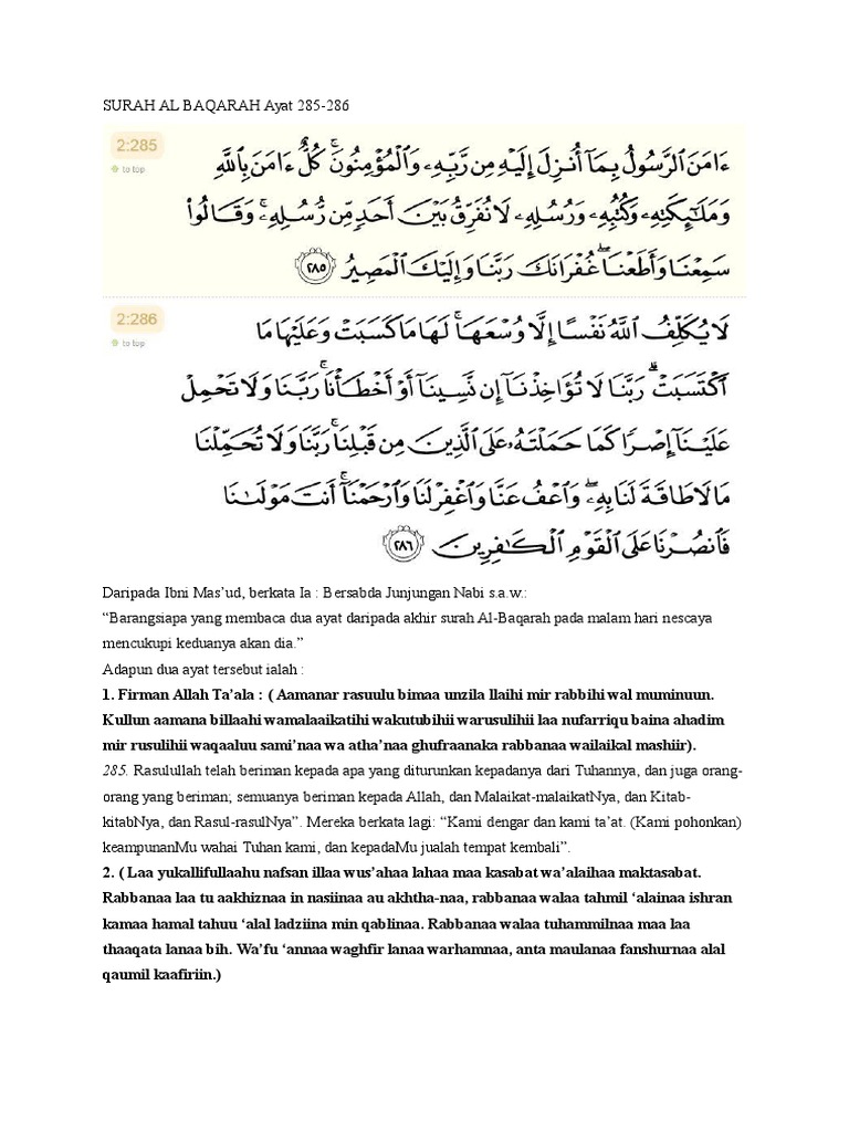 Surah al baqarah ayat 285 286 makna mencukupi keduanya bagi sesiapa yang membacanya ialah mencukupi kepadanya daripada melakukan ibadah pada malam hari atau daripada melakukan bacaan al qur an ataupun dapat menolak keduanya kejahatan dan bencana syaitan atau manusia dan jin atau mencukupi untuk menambah kekuatan iqtikadnya kerana dua ayat itu ada mengandungi makna iman dan amal secara. Surah ali imran ayat 16 baca untuk memohon keampunan dari allah swt. Jadik untuk tidak membazirkan ilmu yang diberikan oleh mak bonda ai yang terchenta. Surah al baqarah ayat 285 286 baca sebelum tidur terselamat dari segala bala bencana dan mara bahaya.