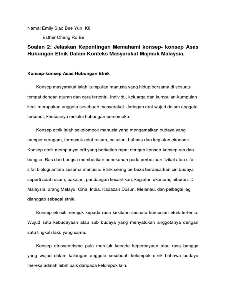 Kepentingan memahami hubungan etnik kepada masyarakat. Pendahuluan kepentingan hubungan etnik di malaysia dalam membentuk perpaduan dalam menongkah era globalisasi yang kian meningkat dari semasa ke semasa tanah air kita hampir mencapai kecemerlangan selaras dengan negara maju yang lain bak kata peribahasa melayu duduk sama rendah. Pengenalan 2 hasil pembelajaran 1 1 etnik ras mendefinisikan dan membincangkan konsep asas 1 2 masyarakat hubungan etnik membezakan konsep perpaduan dan integrasi kaum 1 3 budaya mengenalpasti tahap hubungan kandungan bab 1 etnik 1 4 integrasi menjelaskan komposisi etnik di hubungan etnik malaysia menjelaskan islam meraikan 1 5 etnik malaysia kepelbagaian etnik islam. Kepentingan memahami konsep konsep asas hubungan etnik dalam konteks masyarakat majmuk malaysia. Banyak negara di dunia menjadikan malaysia sebagai negara yang patut dicontohi kerana masyarakat dapat hidup dalam keadaan aman walaupun berbilang bangsa agama dan budaya.