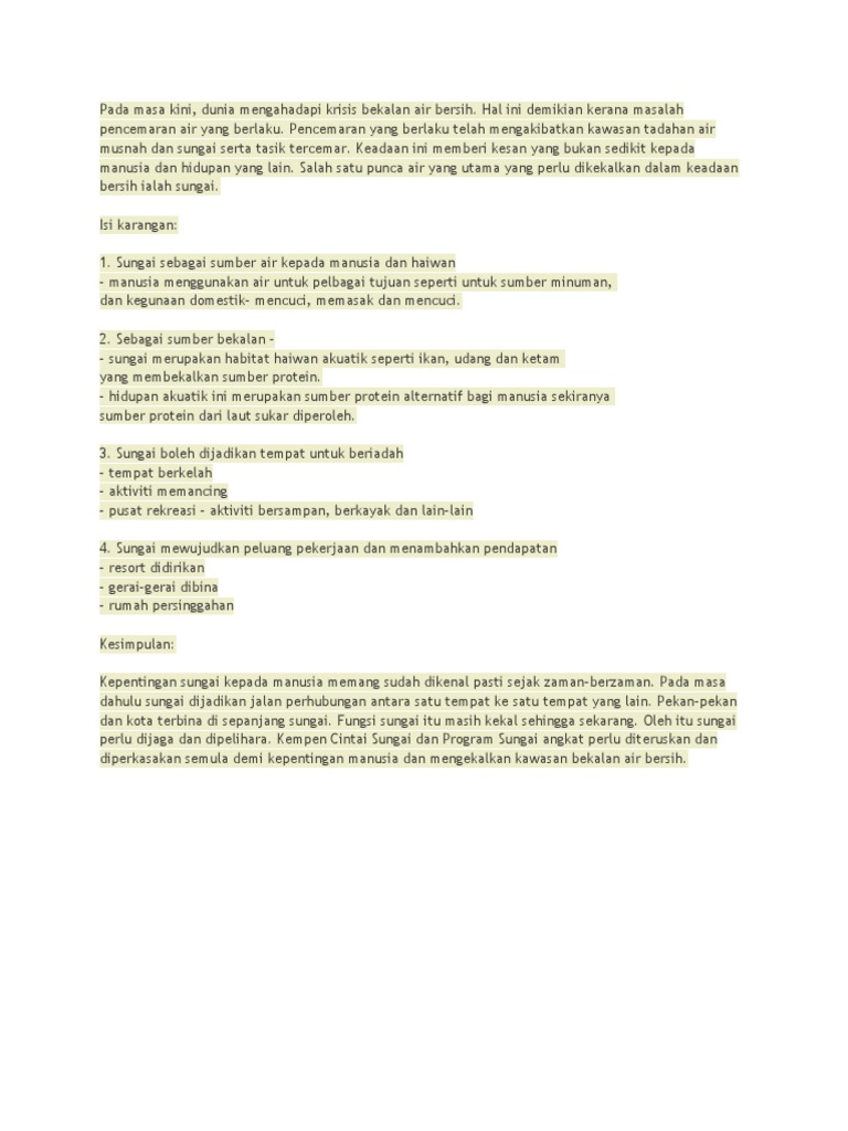 Kepentingan sungai kepada manusia pada masa kini. Kepentingan sungai kepada manusia memang sudah dikenal pasti sejak zaman berzaman. Kepentingan sungai pada masa kini 现今 dunia menghadapi krisis 面临危机 bekalan air bersih 干净 水源供应 hal ini demikian kerana 这是因为 masalah pencemaran air yang berlaku 水源污染的发生 pencemaran yang berlaku telah mengakibatkan 引起 kawasan tadahan air 集水区 musnah 被毁 dan sungai serta tasik tercemar 被 污染 keadaan ini 这样的情况 memberi kesan. Pekan pekan dan kota terbina di sepanjang sungai. Kepentingan sungai kepada manusia memang sudah dikenal pasti sejak zaman berzaman.