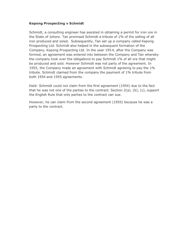 Tan promise to schmidt a tribute of 1 for every iron produced and soled. Page 3 of 4 kepong prospecting ltd v schmidt. T agreed with schmidt in writing that in consideration for schmidt s assistance to obtain a permit and start mining operations t would pay schmidt 1 of the price that all ore from the land was sold at. In the year 1954 after the company formed schmidt was not party of the agreement not until in the year.