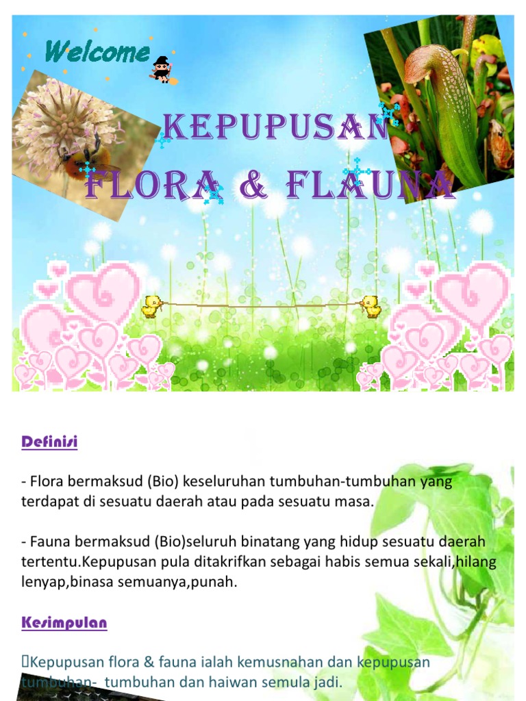 Kepupusan alam flora dan fauna memberi kesan kepada kehidupan manusia. Implikasinya seperti yang kita lihat sekarang banyak spesies spesies flora dan fauna yang semakin diancam kepupusan. Flora dan fauna juga mempunyai hak untuk hidup di bumi hijau ini. Rosmidzatul azila binti mat yamin.