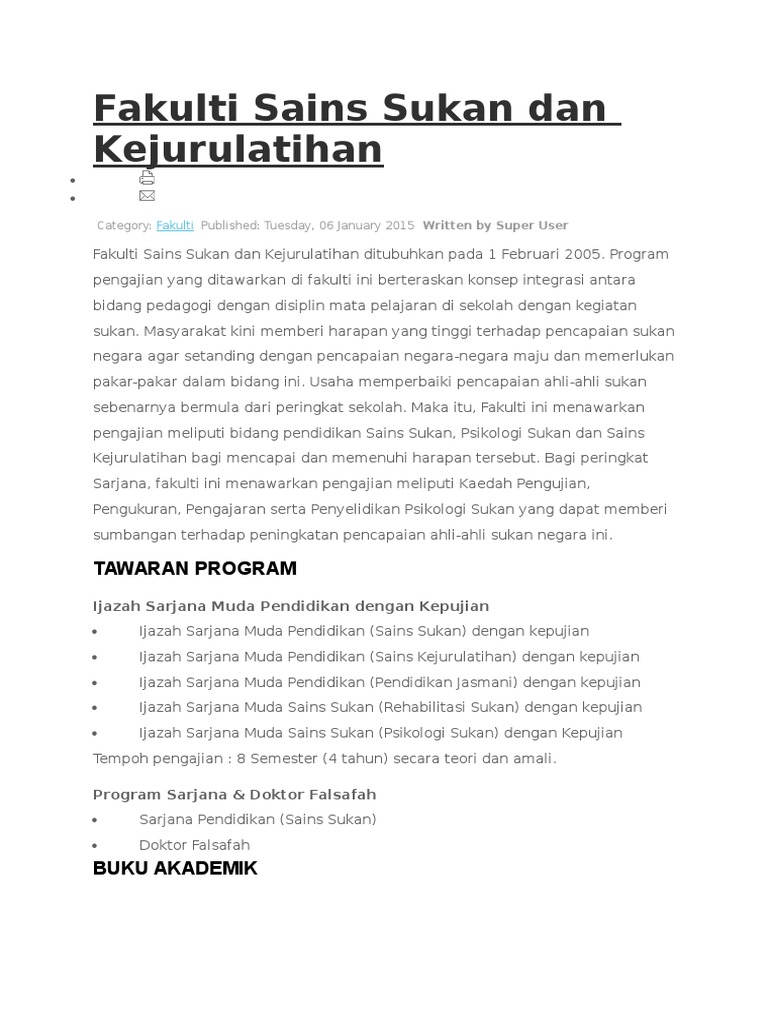 2 0 fakulti sains sukan dan kejurulatihan 2 1 dan mendapat sekurang 2 2 pada peringkat s dalam mana satu 1 mata pelajaran berikut. Mengikut peredaran masa kini majoriti daripada pelajar sains sukan akan memilih atlit sebagai satu kerjaya dalam kehidupan mereka. Pengertian sains sukan dan pendidikannya. Sains sukan secara khususnya suatu proses yang mendalami ilmu pengetahuan diluar skop sukan kepada suatu pembelajaran yang menggabungkan dua proses atau bidang iaitu sains dan sukan.