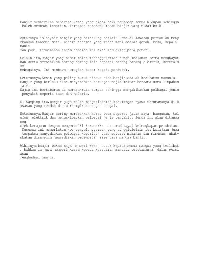 Kesan banjir kepada diri. Bencana banjir monsun mendatangkan pelbagai kesan impak yang positif dan negatif kepada masyarakat penduduk setempat. Di samping itu bencana alam turut memberi kesan kepada kemusnahan flora dan fauna. Kesan terhadap diri sendiri memudaratkan kesihatan risiko mendapat menyakit sekolah berhenti ketinggalan dalam pelajaran terpaksa berpindah ke tempat lain buat sementara waktu kekurangan masa belajar sibuk selesaikan pelbagai masalah disebabkan banjir trauma emosi sukar sesuaikan diri dalam keadaan tidak menentu. Bagi mereka yang mengalami kesan banjir tersebut diharapkan agar kita perbanyakkan sabar.