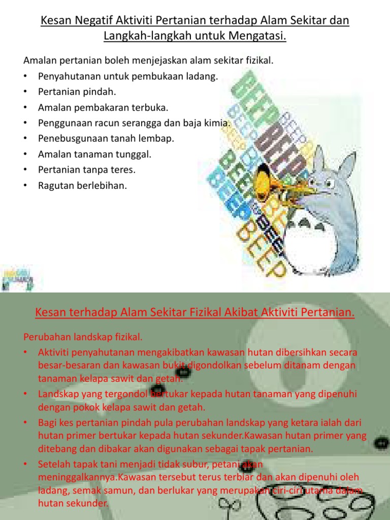 Program pendidikan ini juga bolehdijalankan oleh jas dan lain lain agensi kerajaan serta badan bukan kerajaan ditujukankepada setiap peringkat masyarakat iaitu pentadbir orang ramai dan juga kanak kanaksekolah. 8 2 langkah langkah mengurangkan kesan kegiatan manusia terhadap alam sekitar segala kegiatan manusia yang membawa kesan buruk terhadap alam sekitar perlu diberi perhatian oleh kerajaan. Alam sekitar seharusnya dijaga kerana alam sekitar bukan hanya digunakan pada masa sekarang tetapi akan digunakan sehingga beratus ratus tahun lagi. Kesan kegiatan pertanian terhadap alam sekitar.