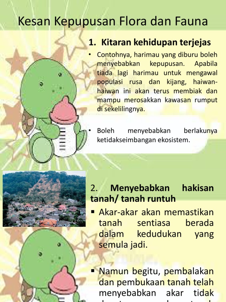 Boleh menyebabkan berlakunya. Akibat yang paling menakutkan ialah kepupusan flora dan fauna. 15 1 kesan kesan kegiatan manusia terhadap tumbuhan semula jadi dan hidupan liar kepupusan flora dan fauna penerokaan sumber hutan akan menyebabkan flora dan fauna terancam kerana kehilangan habitat untuk membiak dan kekurangan sumber makanan. Apabila tiada lagi harimau untuk mengawal populasi rusa dan kijang haiwan haiwan ini akan terus membiak dan mampu merosakkan kawasan rumput di sekelilingnya.