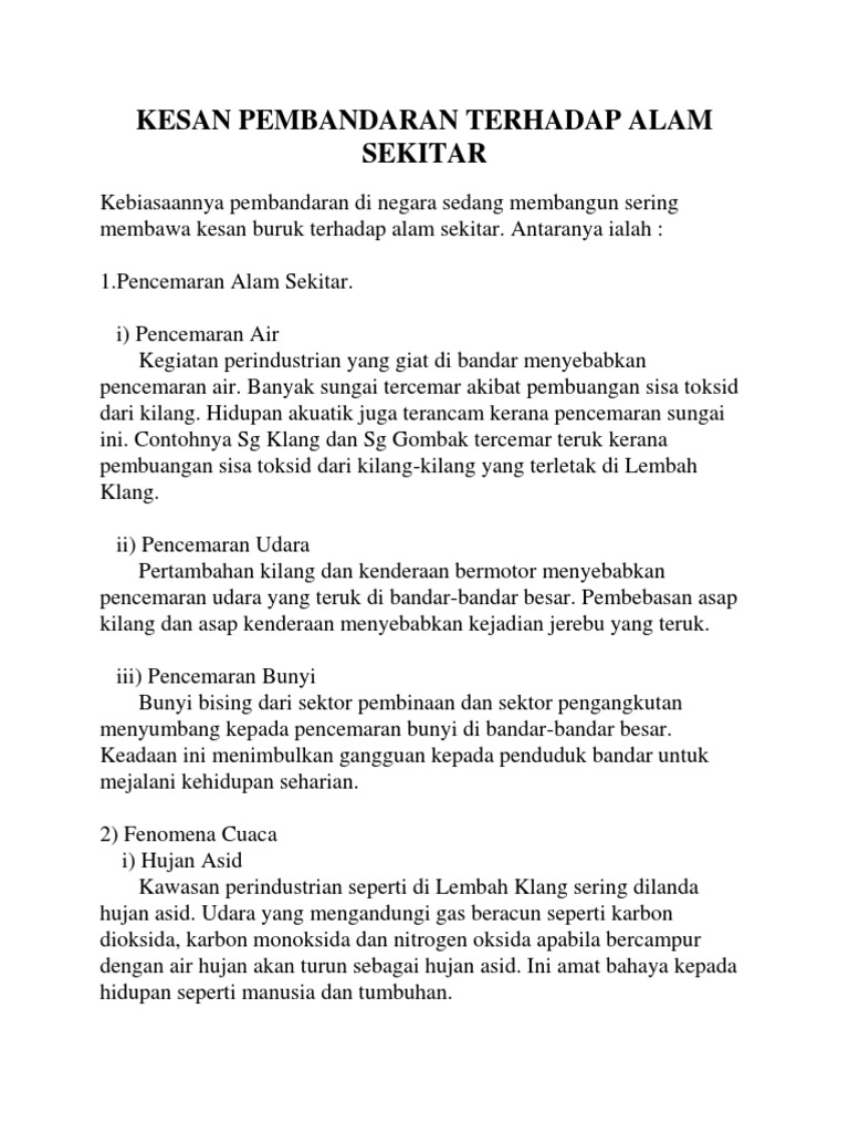 Kesan ke atas pendengar. Menurut world health organization who pencemaran bunyi berada di kedudukan tempat ketiga sebagai bentuk pencemaran alam sekitar yang paling berbahaya selepas pencemaran udara dan air. Pembangunan negara yang pesat menuju status negara industri yang menyebabkan bilangan kenderaan di jalan raya meningkat merupakan antara sumber bunyi utama di negara kita. Pelepasan karbon dioksida yang tinggi di udara dan atmosfera menyebabkan tumbesaran pokok yang luar biasa jerebu dan asap mengurangkan kadar penerimaan cahaya matahari kepada tumbuh tumbuhan dan merosakkan pokok.