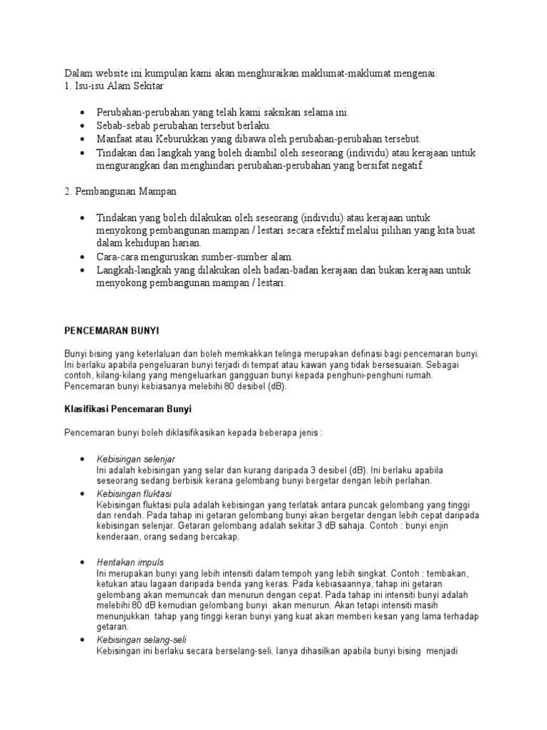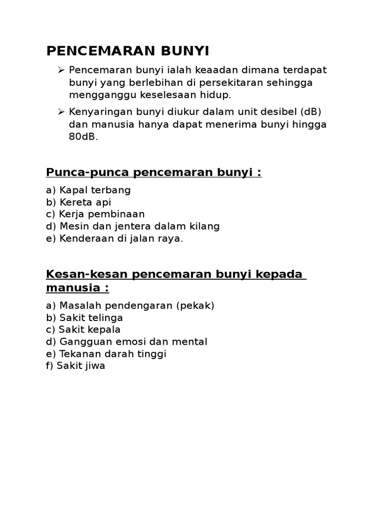 Kesan pencemaran bunyi terhadap alam sekitar. Kesan kesan pencemaran alam sekitar air pencemaran air adalah salah satu penyebab penyakit kronik. Terdapat enam peratauran dan akta yang telah digubal bagi mengawal pencemaran bunyi dan kualiti alam sekitar. Pencemaran bunyi mampu merimaskan memberi tekanan menghilangkan pendegaran gangguan tidur serta kesan buruk lain tekanan dan hipertansi adalah punca utama masalah kesihatan di mana telinga berdengung menyebabkan mengalami masalah daya ingatan serta serangan panik. Kesan ke atas psikologi.
