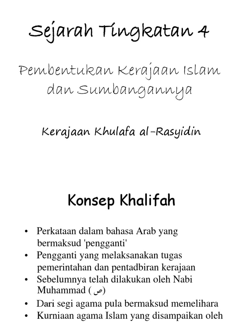 Tema 8 bab 6 tingkatan 4 kerajaan khulafa ar rasyidin. 632 634 m. Semasa muhammad sedang sakit tenat baginda mengarahkan supaya abu bakar mengimamkan solat orang islam. Telah terjadi pertemuan.