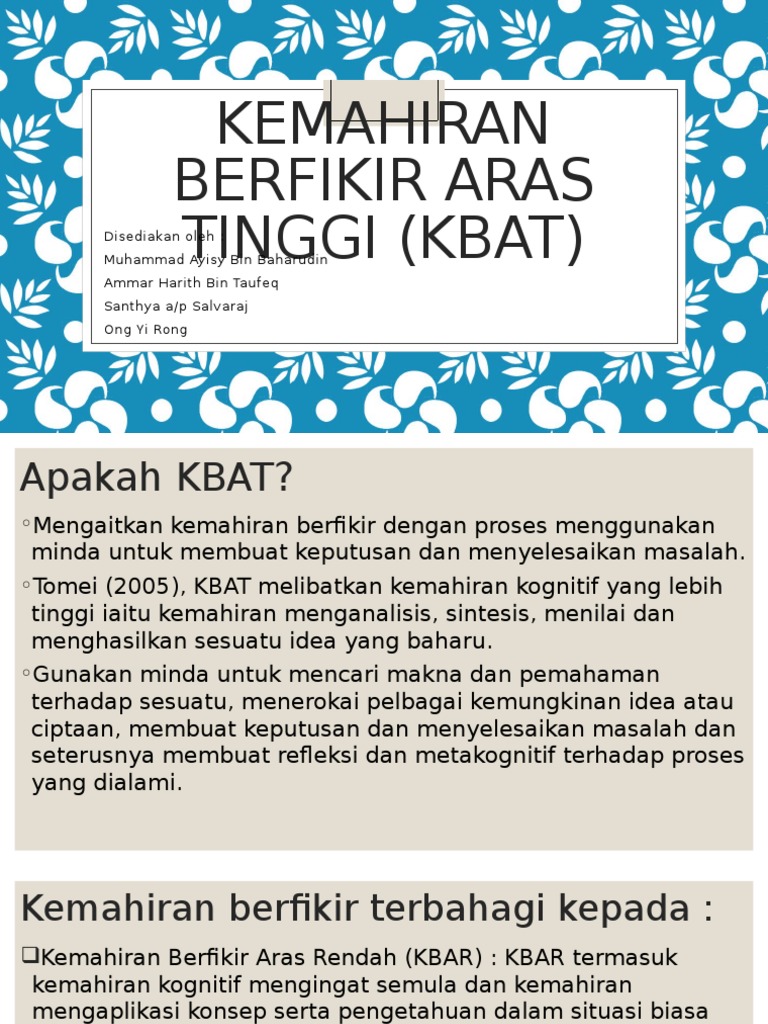 Konsep berfikir aras rendah. Bagi menerapkan kemahiran berfikir aras tinggi di kalangan murid maka peranan guru sangat signifikan. Aras soalan yang diberikan berada pada aras rendah. Kertas konsep ini akan membincangkan penerapan kemahiran berfikir aras tinggi kbat melalui pembelajaran berasaskan projek pbp dalam pembelajaran dan pengajaran sains sekolah rendah transformsi sistem pendidikan negara iaitu seperti yang terkandung dalam perancangan pelan. Konsep kbat kemahiran berfikir aras tinggi 1.