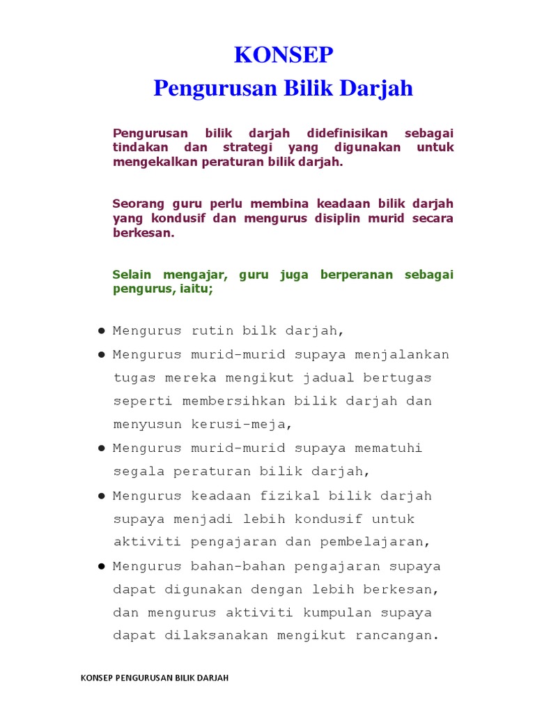 Konsep pengurusan bilik darjah. Alat yang diperkemas dan mudah digunakan yang membantu guru mengurus kerja kursus. Konsep julai 1 2014 pada 3 33 am uncategorized pengurusan bilik darjah merupakan istilah yang digunakan oleh guru untuk menjelaskan tentang proses memastikan pengajaran dan pembelajaran dapat berlangsung meskipun pada masa yang sama terdapat gangguan daripada murid pelajar. Konsep pengurusan bilik darjah pengurusan bermaksud perihal mengurus sesuatu atau perihal mengurus syarikat badan perniagaan dan lain lain kamus dewan edisi ketiga 2002. Pengurusan bilik darjah merupakan sesuatu konsep yang komprehensif untuk pelbagai aktiviti guru yang dirancang dengan tujuan memudahcarakan pengajaran dan pembelajaran dalam bilik darjah merangkumi tindakan disiplim rutin harian penyusunan tempat duduk dan memperuntukkan masa pelajaran.