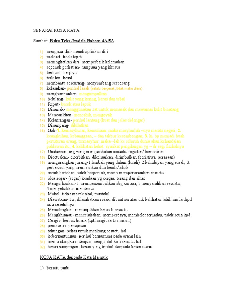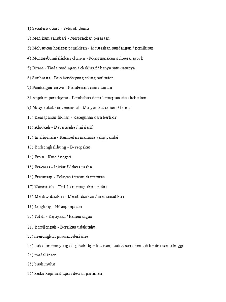 1 1 penguasaan kosa kata dalam pembelajaran bahasa arab kosa kata menurut kamus besar bahasa indonesia berarti perbendaharaan kata 5 sedangkan soemargono mendefinisikan pengertian kosa kata sebagai sejumlah kata yang disukai pemakainya 6 berdasarkan definisi tersebut dapat disimpulkan bahwa penguasaan kosa kata merupakan jumlah kata yang. Sistem tulisan dan ejaan a sebelum kedatangan pengaruh india terdapat tulisan lontar sulawesi selatan tulisan batak sumatera utara tulisan rencong sumatera selatan b tulisan pada batu bersurat. Unduh sebagai docx pdf txt atau baca online dari scribd. Kosa kata istilah 7.