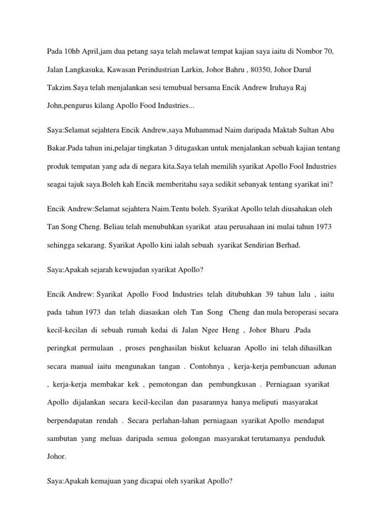 Consumer products services company website annual report. Dy noraini adalah pengasas noraini bakery seorang yang aktif dan gemar dalam pembuatan berjenis jenis kek dan biskut telah mengikuti beberapa kursus dari orang orang berpengalaman baik dari dalam mahupun luar negri seperti dari singapura mula di tubuhkan pada tahun 1995 diusahakan sendiri dengan dibantu oleh suami dan anak anak dikenali dengan. 3 1 latar belakang syarikat syarikat apollo food holdings berhad adalah sebuah syarikat yang mengeluarkan produk makanan. Pengumuman syarikat lawatan berpandu english.