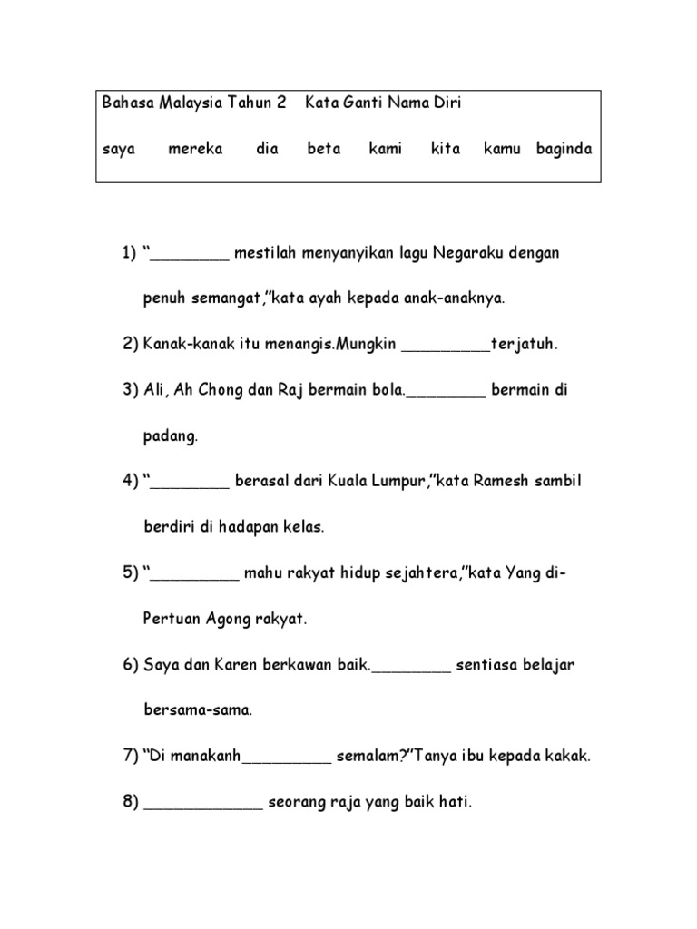 Latihan Bahasa Melayu Tahun 2 Kata Ganti Nama Diri