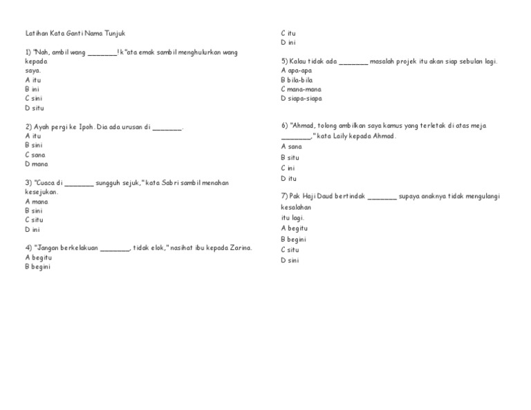 Gunalah duit ini untuk membeli buku latihan kamu. A ini b begini c begitu d demikian 21 ibu duit adik farah hilang semasa bermain seorang diri di taman permainan kata umi kepada ibunya. Latihan tatabahasa kata ganti nama tempat dan tunjuk untuk murid sekolah rendah dan pelajar sekolah menengah tahun 1 hingga tahun 6 dan tingkatan 1 hingga 5. Lelaki yang berkemeja biru itu abang saya.