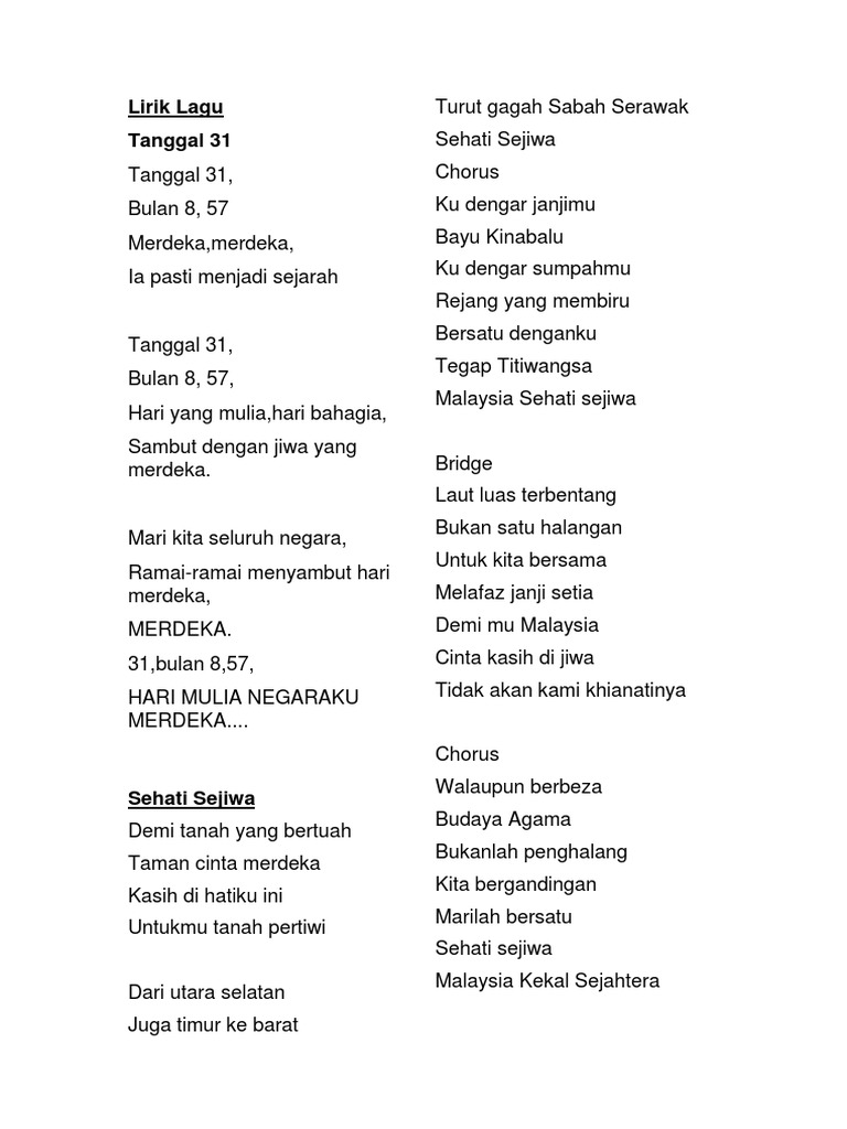 Tanggal 31 bulan lapan lima puluh tujuh hari yang mulia hari bahagia sambut dengan jiwa yang merdeka. 31 bulan 8 57 perjuangkan pertahankan tanah airku impian aku gemilang baru satu suara laungkan merdeka bangkit semua demi negara selamanya kita merdeka. Tanggal 31 bulan lapan lima puluh tujuh hari yang mulia hari bahagia sambut dengan jiwa yang merdeka mari kita seluruh warga negara ramai ramai menyambut hari merdeka merdeka. Lirik lagu tanggal 31 tanggal 31 bulan 8 57 hari yang mulia hari bahagia ia pasti menjadi sejarah.