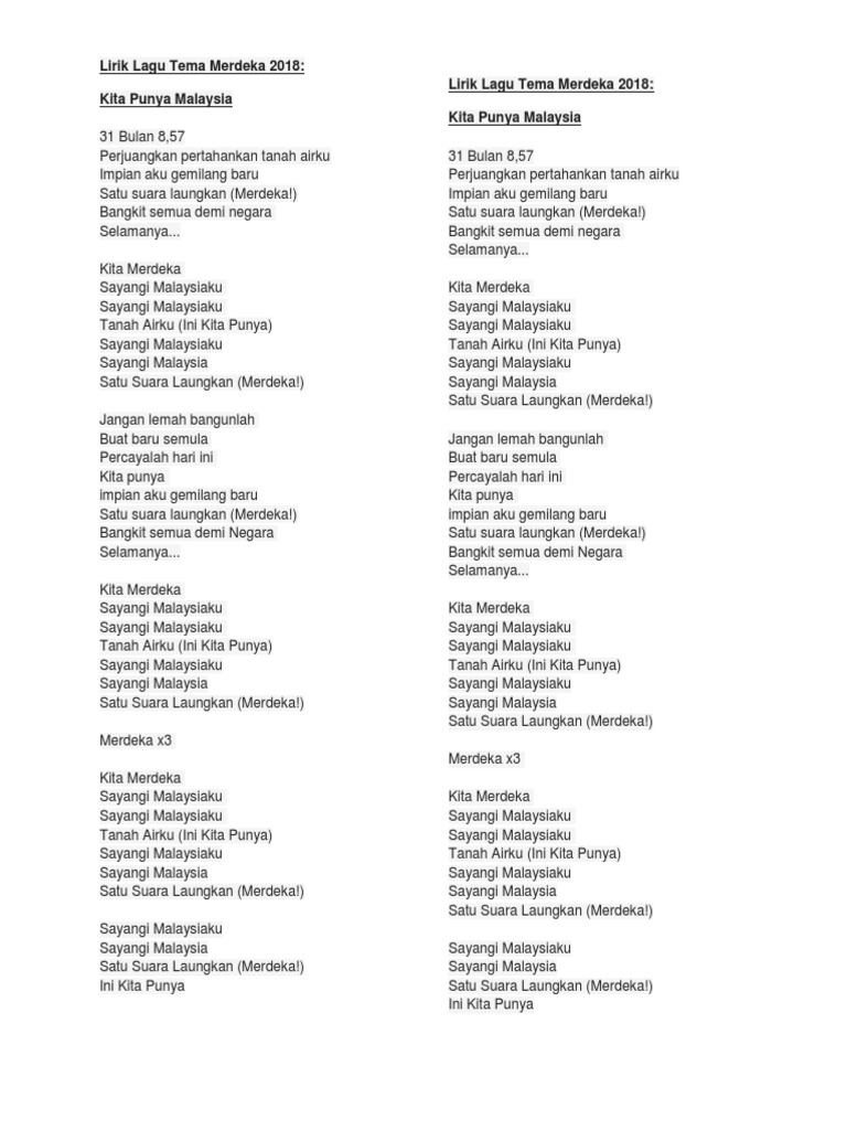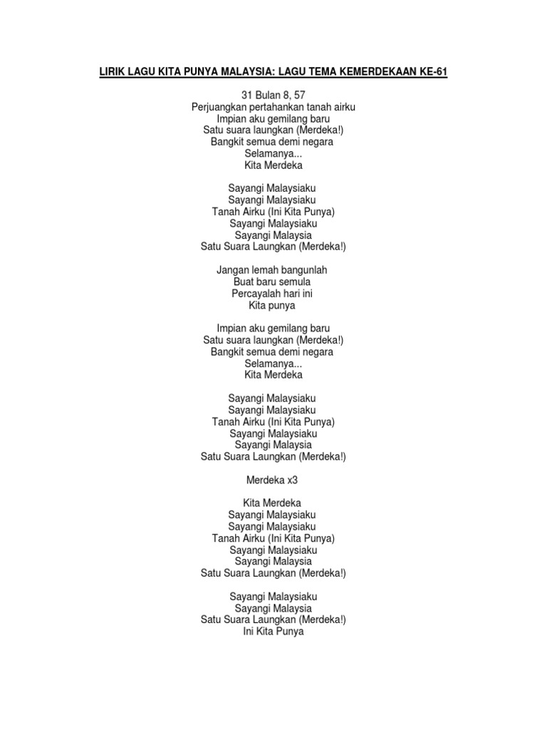 Lirik lagu tema merdeka 2018. Merdeka 31 bulan 8 57 hari mulia negara ku merdeka. Kita punya malaysia 31 bulan 8 57 perjuangkan pertahankan tanah airku impian aku gemilang baru satu suara laungkan merdeka. Tetaplah merdeka ia pasti menjadi sejarah tanggal 31 bulan lapan lima puluh tujuh hari yang mulia hari bahagia sambut dengan jiwa yang merdeka.